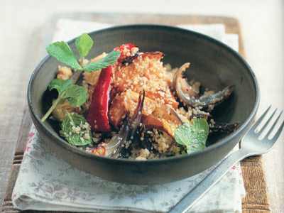 Use a fork to fluff and aerate the couscous, then add the cooked vegetables and place some mint sprigs on top. Add a little lemon juice and salt and pepper to taste.